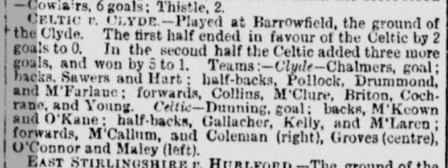 The Bhoys lined up: Dunning, O’Kane, McKeown, Gallacher, Kelly, McLaren, O’Connor, Maley, Groves, McCallum, Coleman. Newspapers disagree on which ‘Maley’; some identify Willie, others Tom. Given the forward position, it is more likely to be Tom, but some ‘reports specifically name Willie as a scorer.