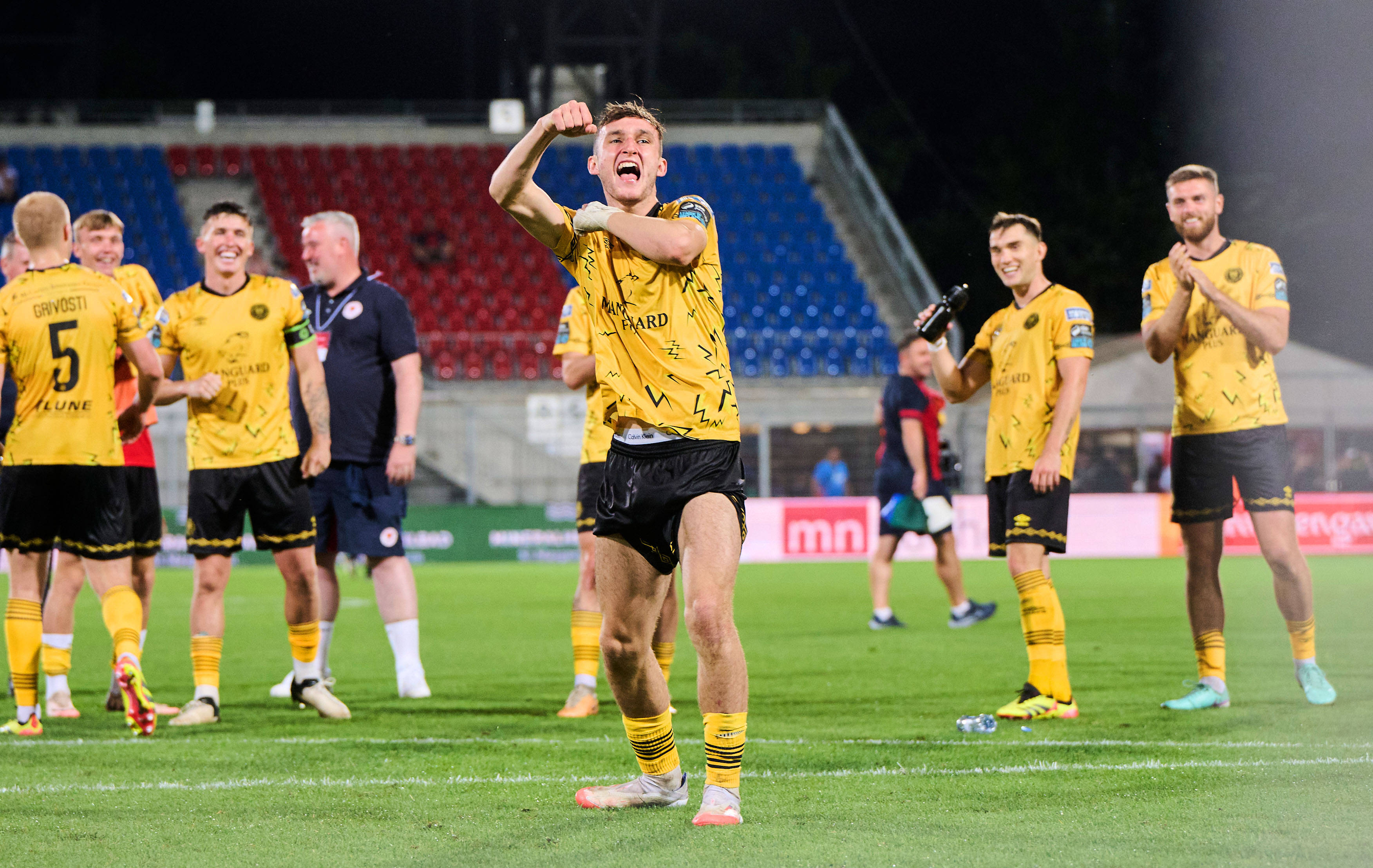 UEFA Europa Conference League Second Qualifying Round First Leg, Rheinpark Stadion, Vaduz, Liechtenstein 1/8/2024 Vaduz vs St. Patrick s Athletic Patricks Athletics Mason Melia celebrates winning the game over two legs.1/8/2024.Photo:INPHO/MichaelZanghellini