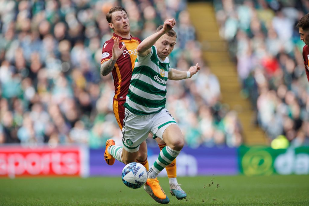 Celtic v Motherwell – Alistair Johnston gets taken down by Callum Slattery during the cinch Premiership match at Celtic Park, Saturday April 22, 2023. Photo Steve Welsh