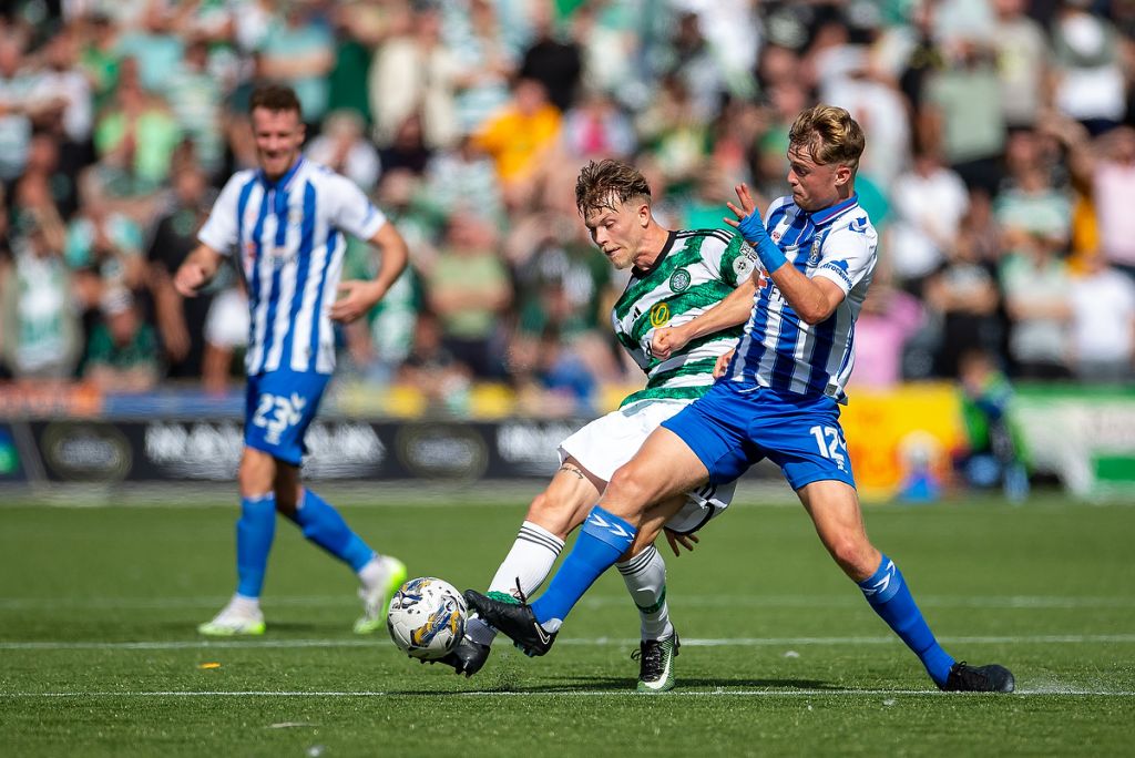 20th August 2023; Rugby Park, Kilmarnock, Scotland: Scottish Viaplay Cup Football, Kilmarnock versus Celtic; David Watson of Kilmarnock tackles Odin Thiago Holm of Celtic