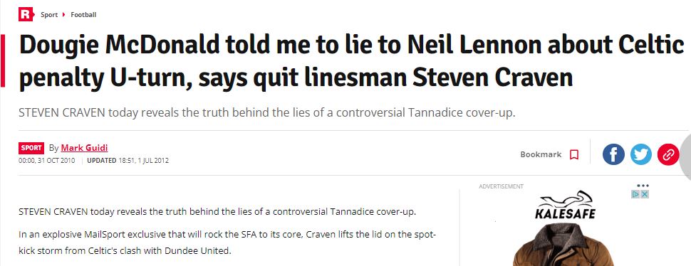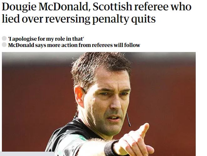 A month prior to Hugh Dallas’ email scandal, we had Dougie gate. On that occasion, Scottish referee Dougie McDonald was forced to resign after his lies were exposed by one of his colleagues Steven Craven. Dougie McDonald was said to have lied to Hoops boss Neil Lennon about his sensational penalty U-turn at Tannadice, when Gary Hooper was fouled in the box. Both Craven and McDonald came clean to Referees chief Hugh Dallas, and Dallas allegedly tried TWICE to get Craven to repeat what he knew to be a lie.