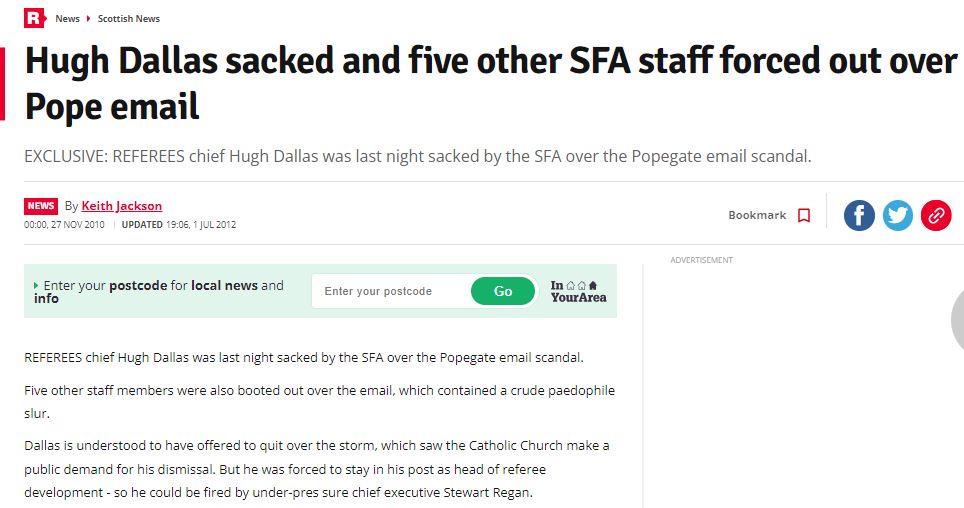 In terms of more direct suspicion surrounding on pitch matters, the former Head of Referee Development Hugh Dallas left the SFA after being disgraced when he was caught sending anti-Catholic emails, including a paedophile slur against the Pope. Dallas was once a referee himself.