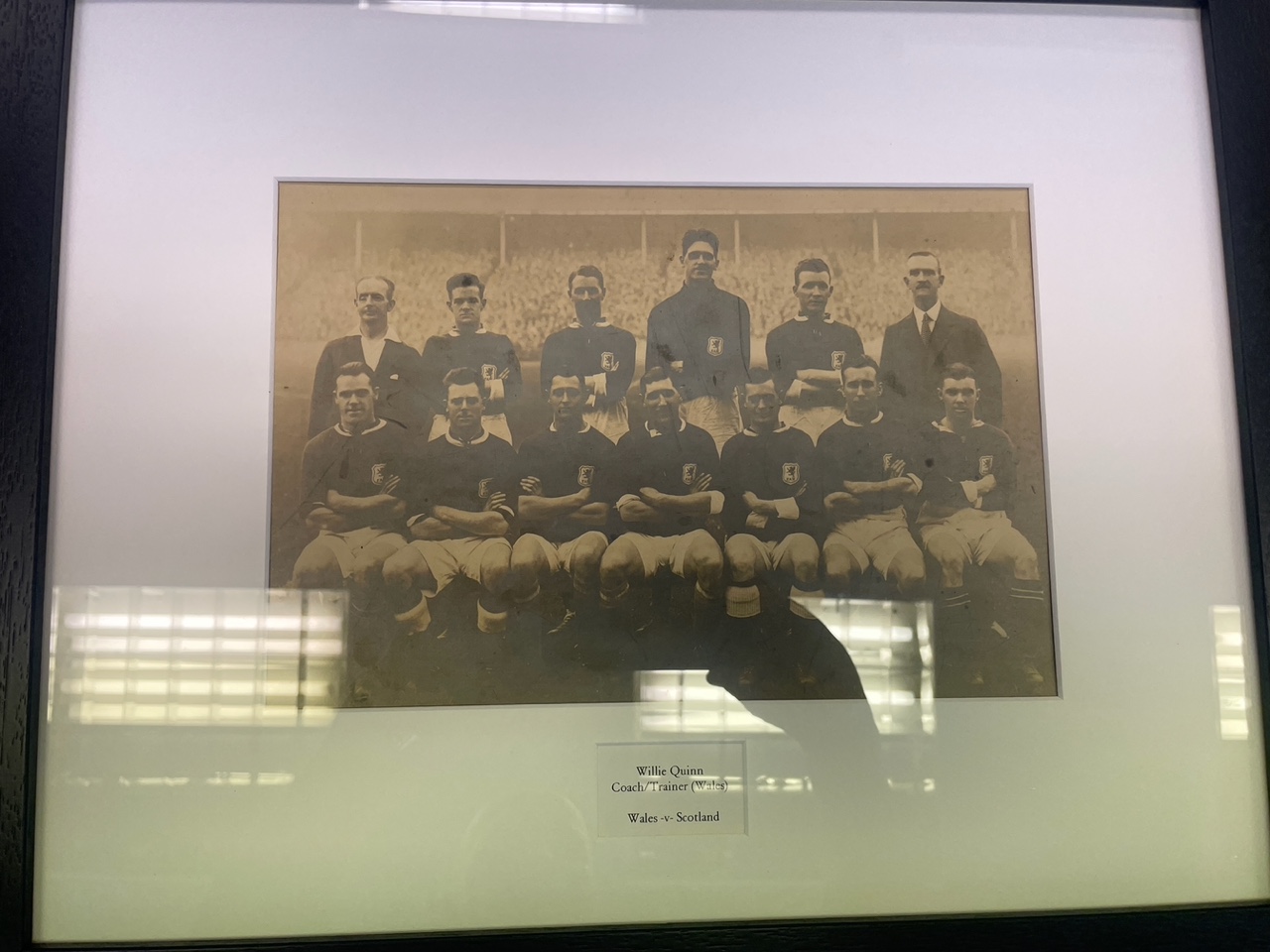 This shows an older Will Quinn with the Welsh international team, and with what I believe to be the north enclosure at Ibrox in the background. If that is correct, then the only two matches which fit that description and Will’s timeline took place on Saturday, 30 October 1926 and Saturday, 27 October 1928. I have identified the Welsh goalkeeper as Bert Gray of Oldham Athletic then Manchester City, and the captain as Fred Keenor of Cardiff City, but they played in both matches! However, the absence of Arsenal winger Charlie Jones from the photograph convinced me that this image relates to the latter match, played in October 1928.