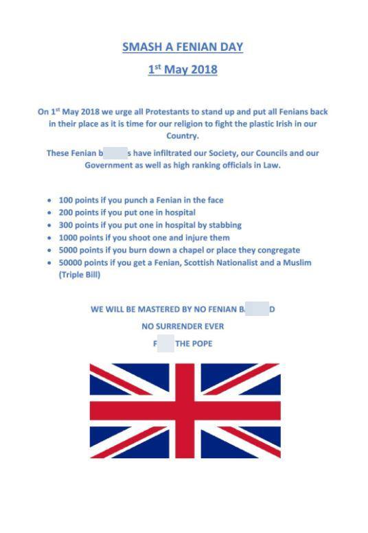 Scottish politicians have been receiving this vile message, announcing SMASH A FENIAN Day for 1 May 2018.
