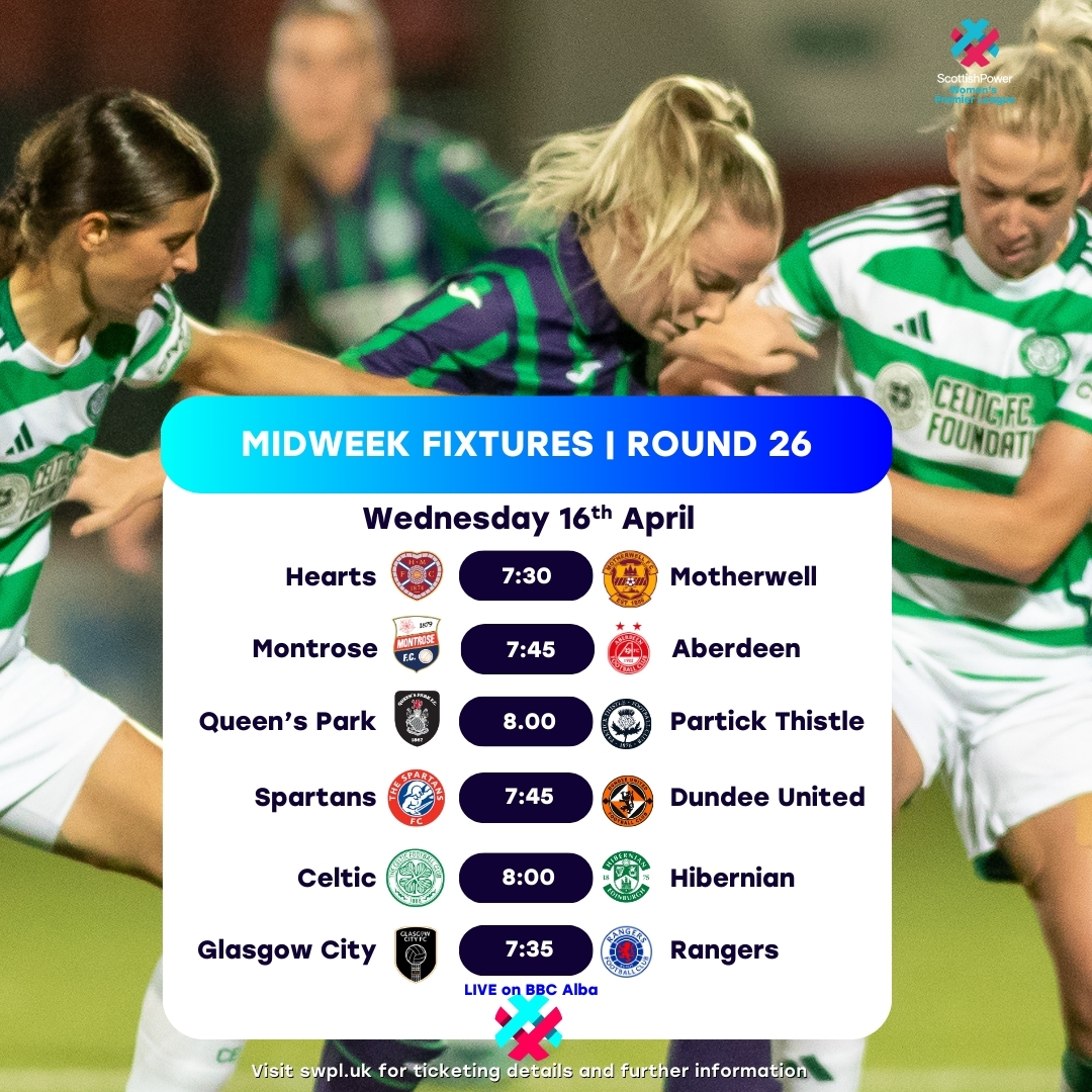 Here are the SWPL 1 fixtures for Wednesday evening with Celtic taking on Hibs. With Hearts at home to Motherwell that should be three points for them so Celtic need to beat Hibs to avoid dropping to fifth. At least Motherwell can’t catch us!