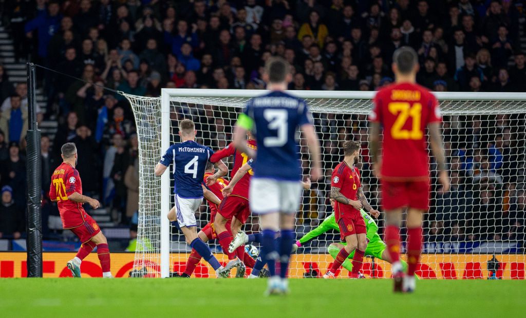 As did Callum McGregor’s late sojourn across the midfield then down the right wing, passing tired Spanish challenges on the way, as the Celtic captain carried Scotland forward, as incessant Spanish pressure had forced Scotland on to the backfoot late in the game.