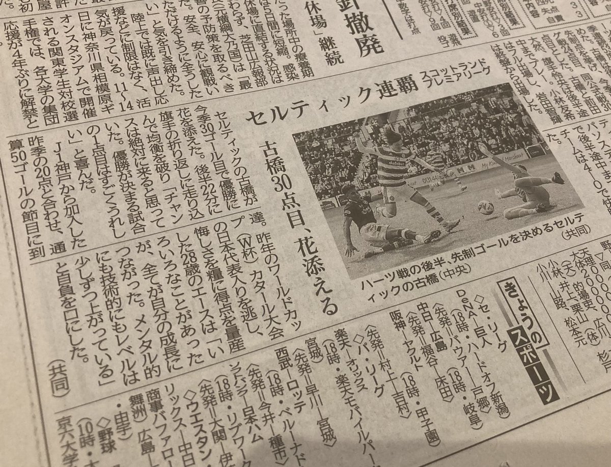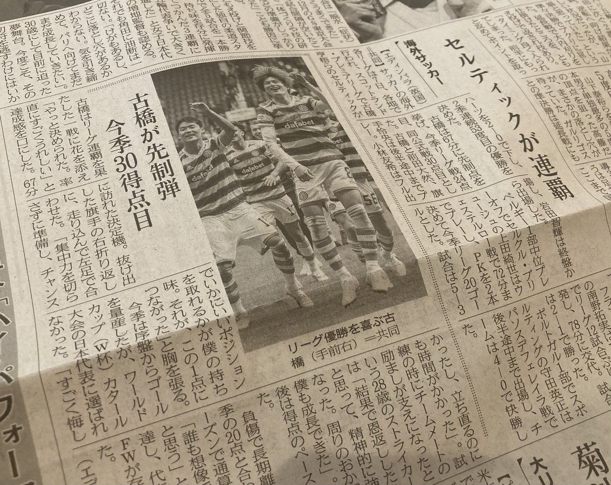As mentioned in my previous article, many Japanese media outlets reported the news that Celtic won the league title on the Internet immediately after the game. However, as you know, the readers of Internet news and the ones of conventional newspapers published on printed paper are completely different, so it was necessary to check the printed newspapers in order to fully appreciate the coverage status of this Celtic news in Japan.