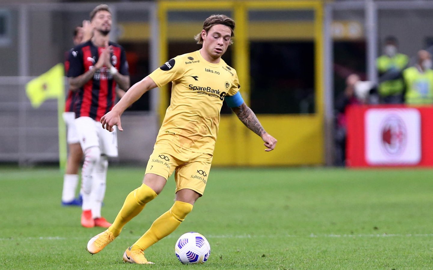 Rade Krunic of AC Milan is challenged by Patrick Berg of Bodo Glimt during the UEFA Europa League third qualifying round match between AC Milan and Bodo Glimt at Stadio Giuseppe Meazza on September 24, 2020 in Milan, Italy. (Photo by Emilio Andreoli/Getty Images)