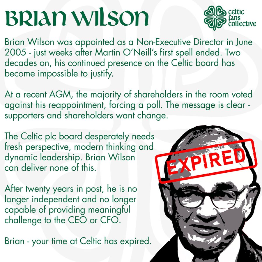 “Brian Wilson was appointed as a Non-Executive Director in June 2005 – just weeks after Martin O’Neill’s first spell ended. Two decades on, his continued presence on the Celtic board has become impossible to justify. At a recent AGM, the majority of shareholders in the room voted against his reappointment. The message is clear – supporters and shareholders want change.